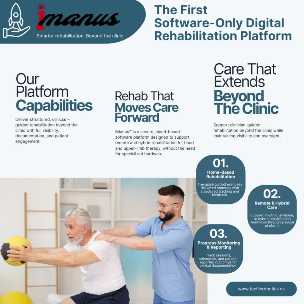Tactile Robotics has announced the upcoming launch of iManus™, its software-only digital tele-rehabilitation platform, planned for early 2026. Designed to extend clinician-guided rehabilitation beyond traditional clinical settings, iManus enables structured, remote, and hybrid care delivery without the need for specialized hardware.